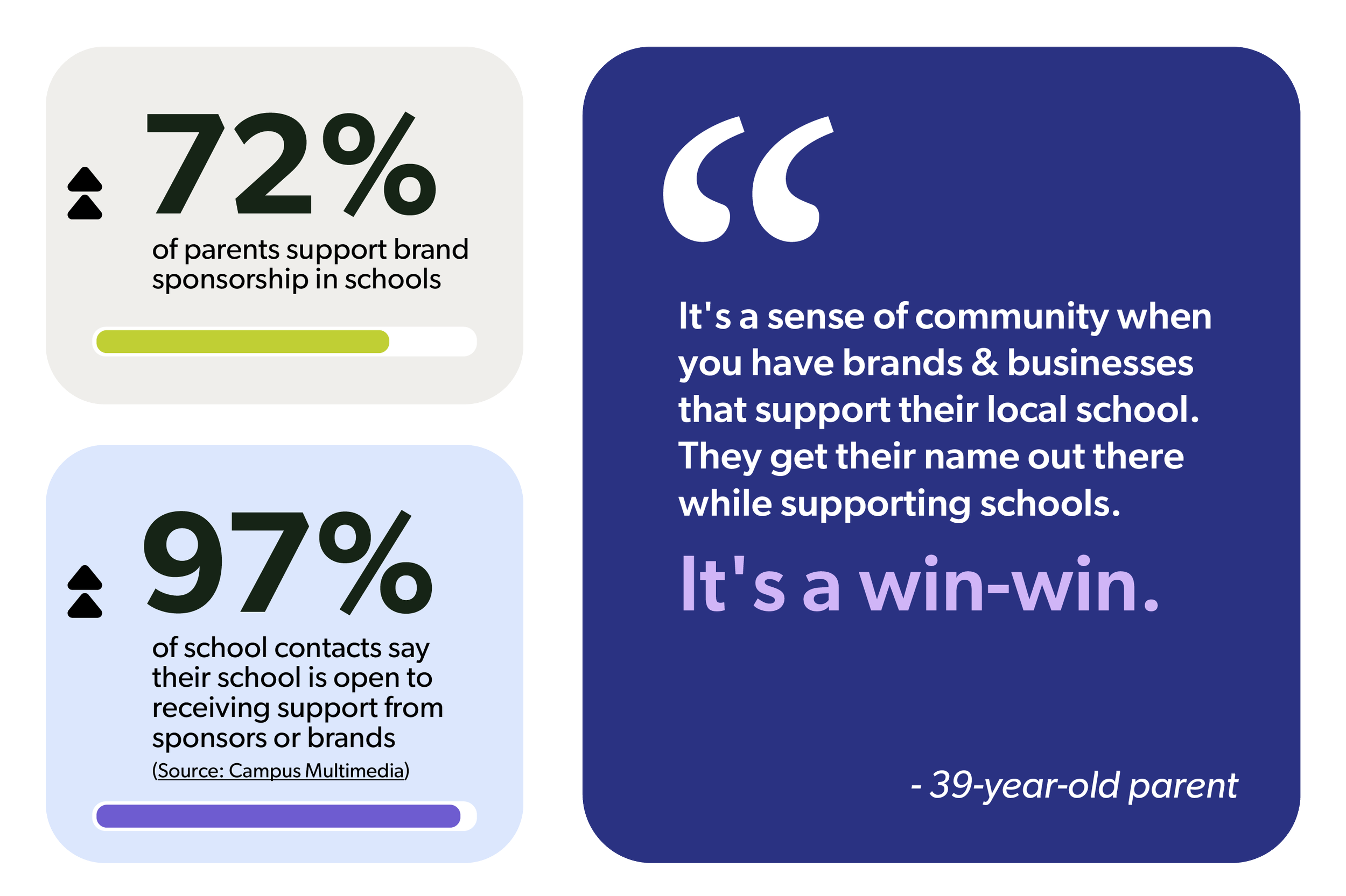 Schools are trusted, year-round community hubs. When brands support schools, they align with that trust and build meaningful connections through visible, local impact.